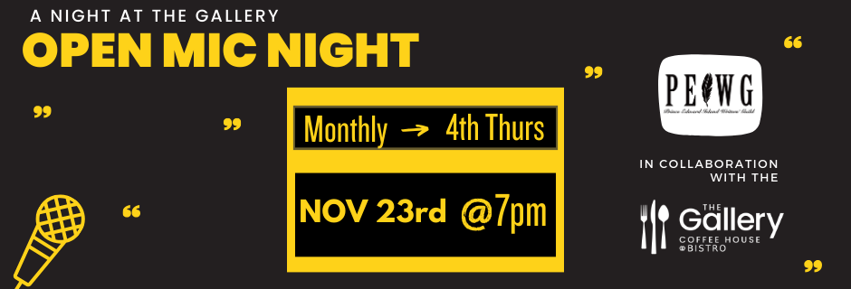 The PEI Writers' Guild and The Gallery Coffee House & Bistro are proud to work together in bringing this platform for writers to the Charlottetown area on THURSDAY, NOVEMBER 23rd @ 7pm!